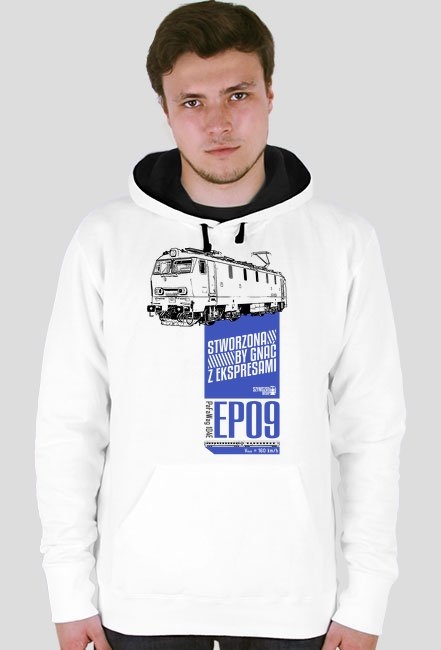 Bluza z kapturem z lokomotywą EP09, którą można krótko opisać hasłem Stworzona by gnać z ekspresami.