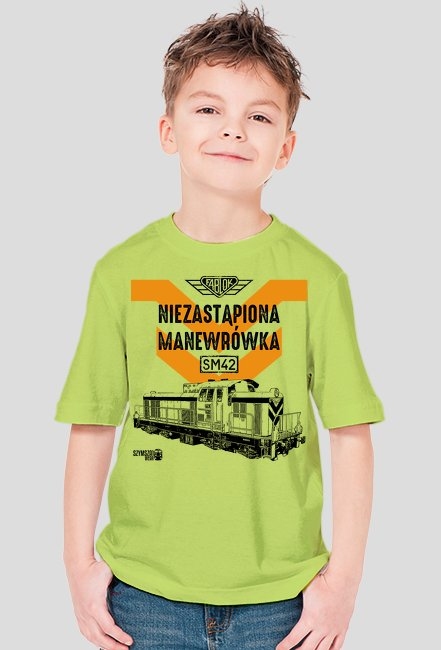 Koszulka dziecięca przedstawiająca najpopularniejszy pojazd manewrowy na polskich torach, czyli SM42. Wóz ten można opisać krótko - Niezastąpiona manewrówka.