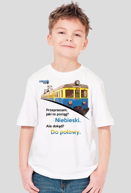 Klasyczny dowcip w koszulkowej formie. Koszulka dziecięca wraz z wizerunkiem pociągu EN57 w malowaniu o którym jest kawał.