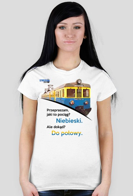Klasyczny dowcip w koszulkowej formie. Koszulka damska wraz z wizerunkiem pociągu EN57 w malowaniu o którym jest kawał.