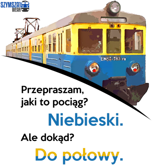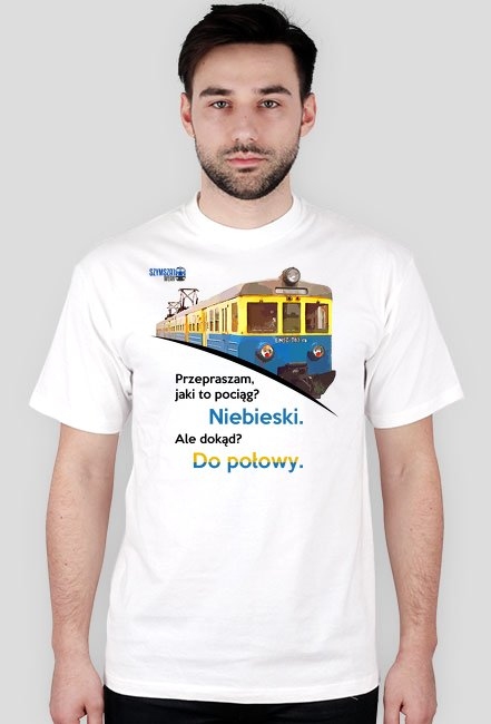 Klasyczny dowcip w koszulkowej formie. Koszulka męska wraz z wizerunkiem pociągu EN57 w malowaniu o którym jest kawał.