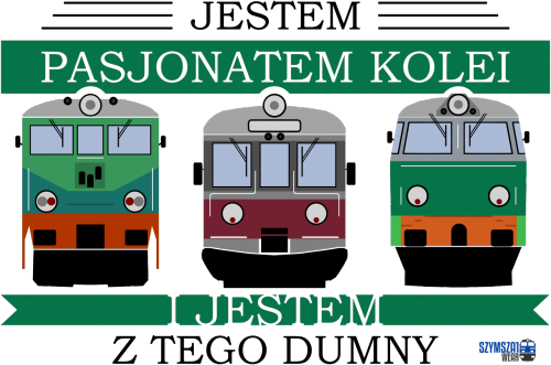 Plakat ze wzorem Jestem pasjonatem kolei i jestem z tego dumny przedstawiającym trzy popularne pojazdy na polskich torach: EU07, EN57 i ET22.